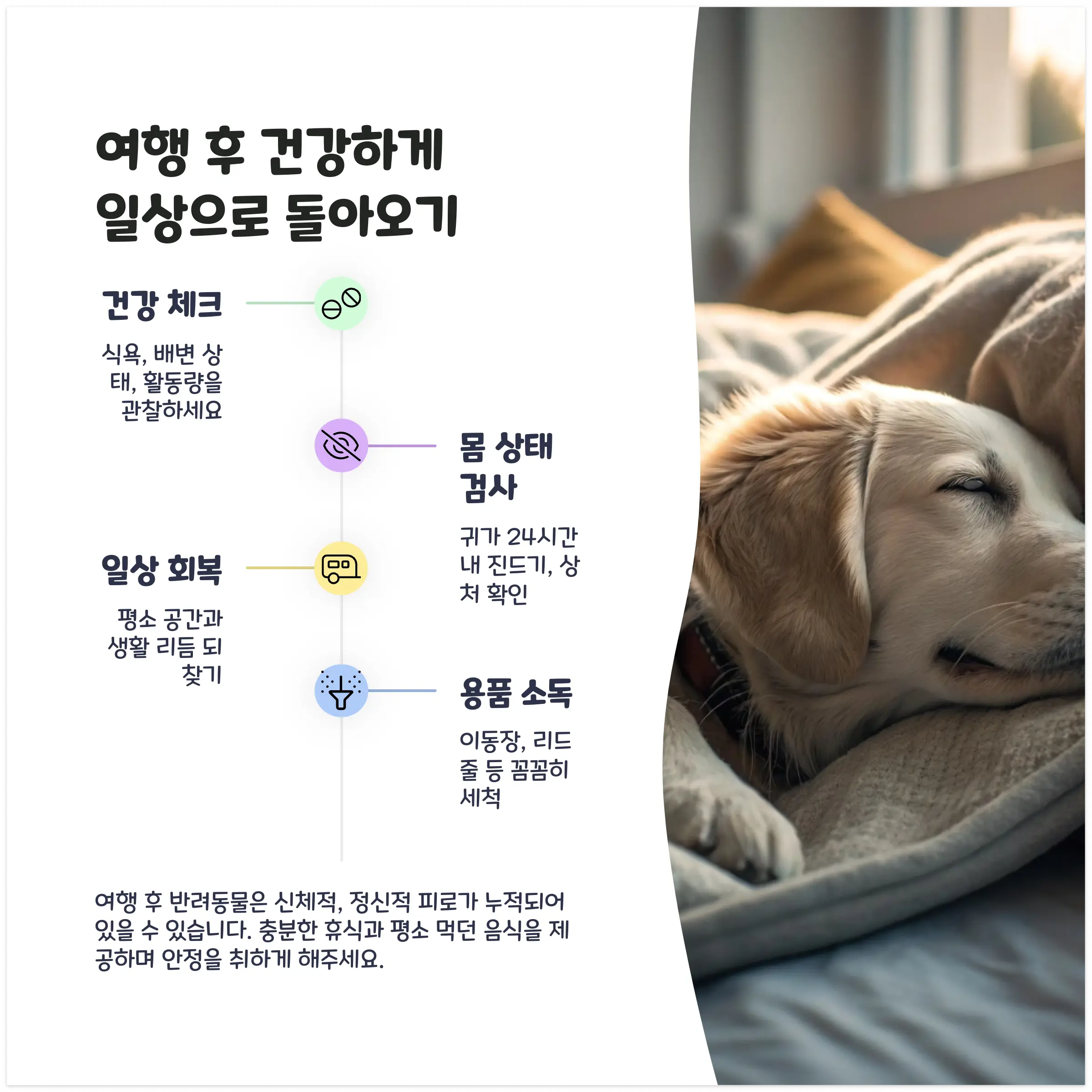 여행의 끝은 단지 '귀가'가 아니에요. 반려동물에게는 여행이라는 비일상적인 일정 자체가 큰 자극이고, 피로감으로 이어지기 쉽거든요. 돌아온 후의 관리가 잘 이뤄져야 다음 여행도 편하게 이어질 수 있어요.
