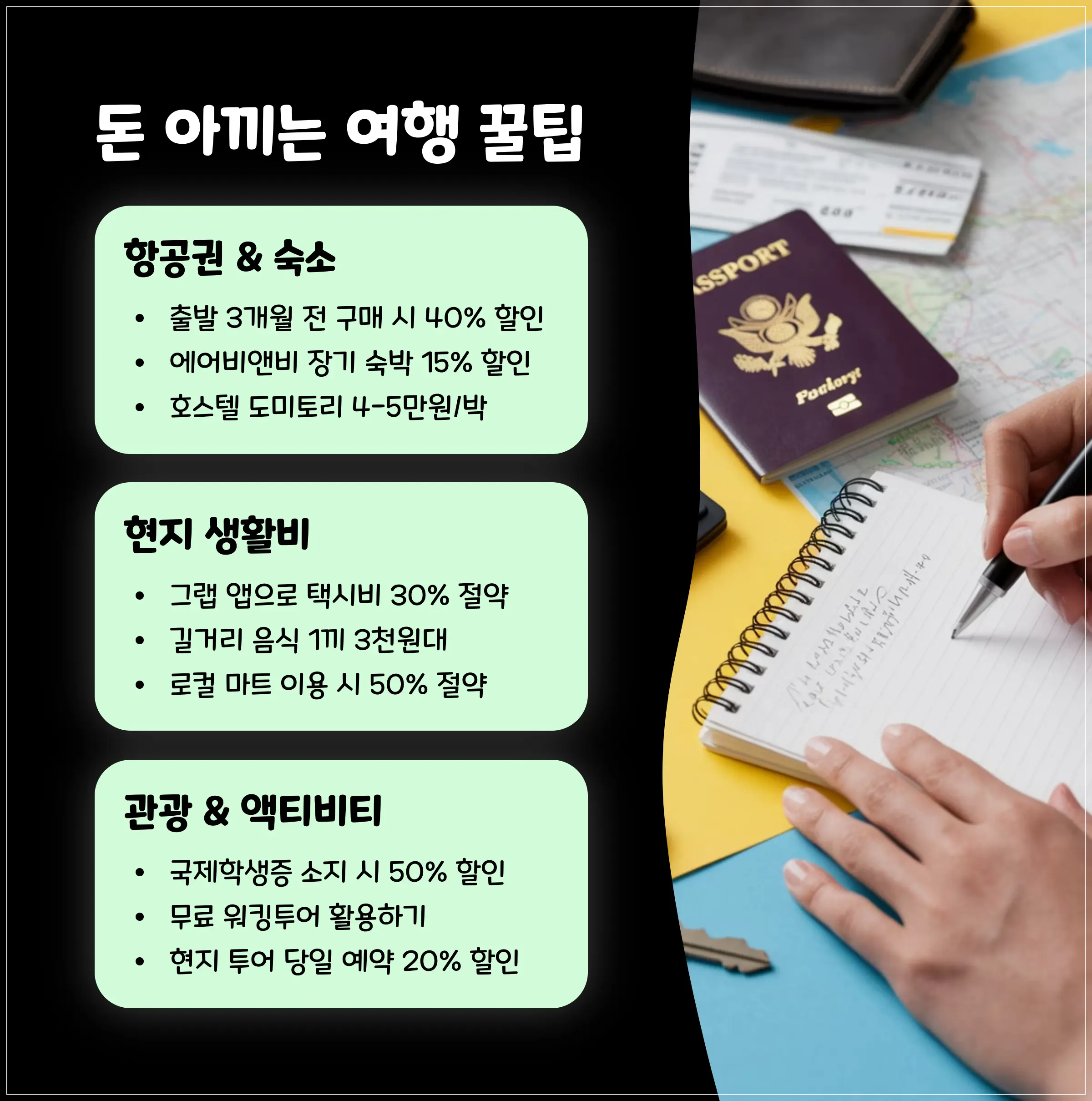 이 팁들만 잘 활용해도, 예산 100만원 이내로도 퀄리티 높은 해외여행 충분히 가능해요! 💪
