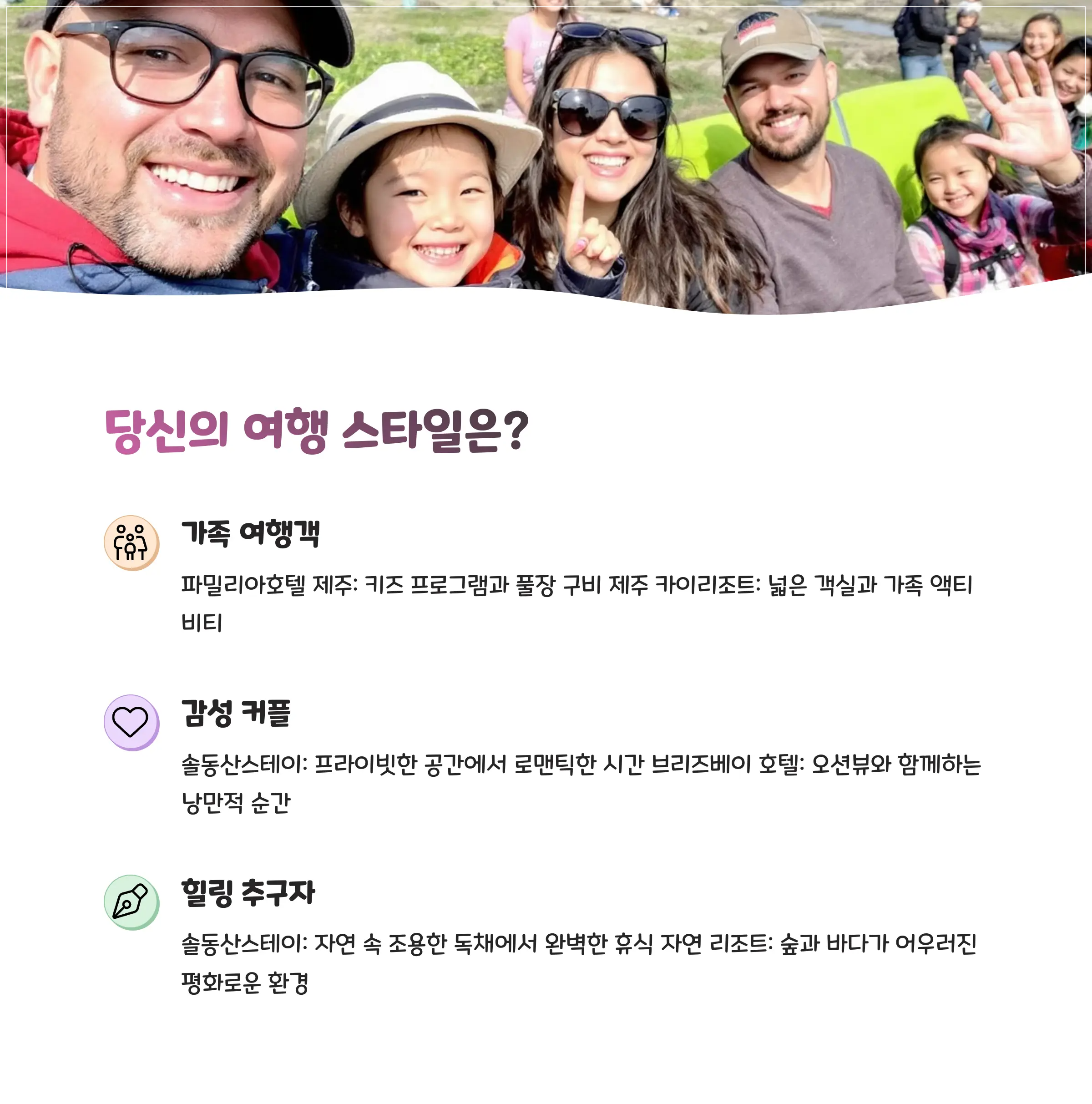 이번에는 여행자 스타일별로 숙소와 코스를 조합해서 추천해 드릴게요. 혼자여도, 커플이든, 가족이든 누구나 만족할 수 있도록 구성했어요. 아래에서 자신에게 딱 맞는 타입을 찾아보세요!