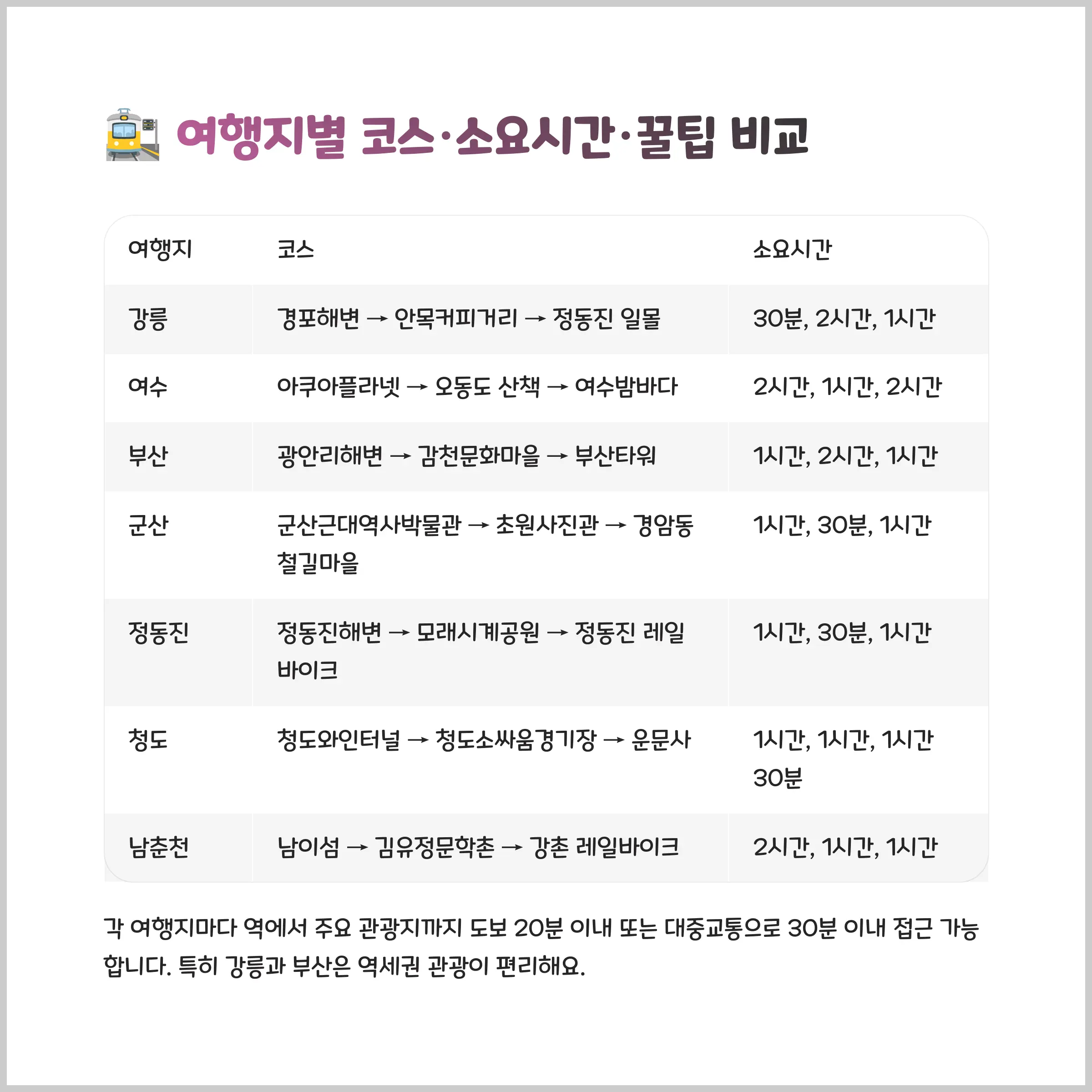 🚉 여행지별 코스, 소요시간, 꿀팁 비교