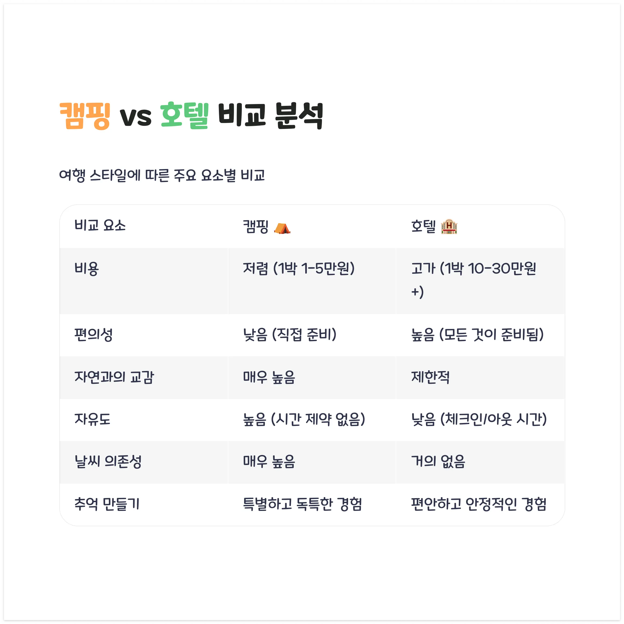 ⚖️ 캠핑 vs 호텔 비교 분석