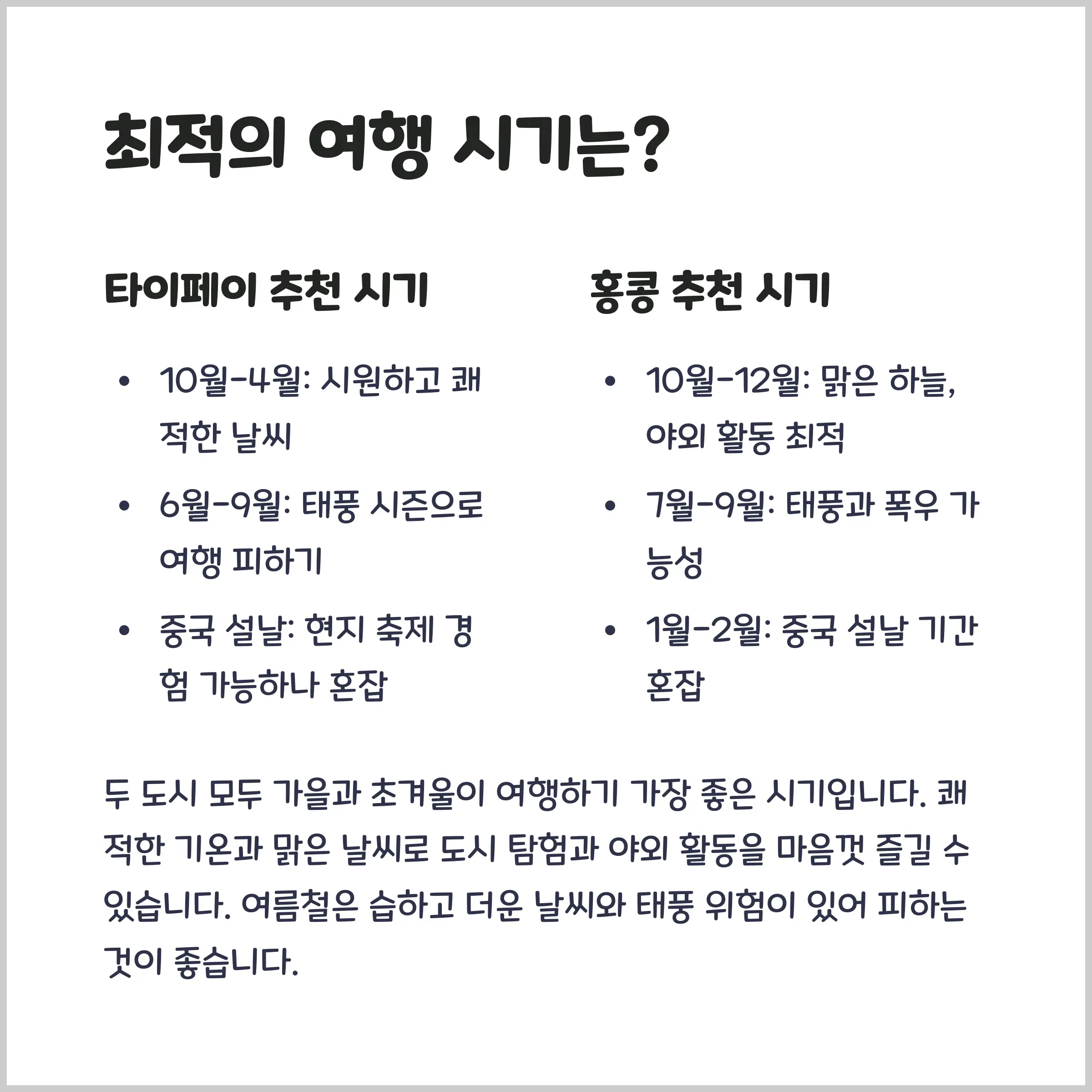 ✔️ 총비용 비교: 타이페이는 60~90만 원으로 ‘합리적인 근거리 여행’, 홍콩은 80~120만 원 수준의 ‘프리미엄 도심 여행’으로 정리할 수 있어요.