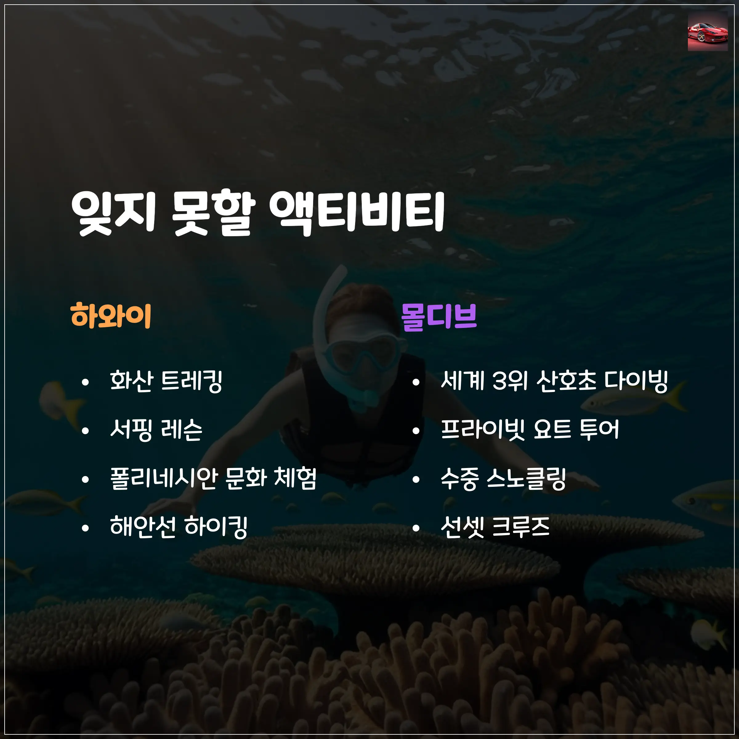 신혼여행을 떠났는데 “뭐 하고 놀지?”는 매우 중요한 질문이에요. 하와이와 몰디브는 액티비티 자체가 완전 다르기 때문에, 이 부분에서 확실히 갈려요.