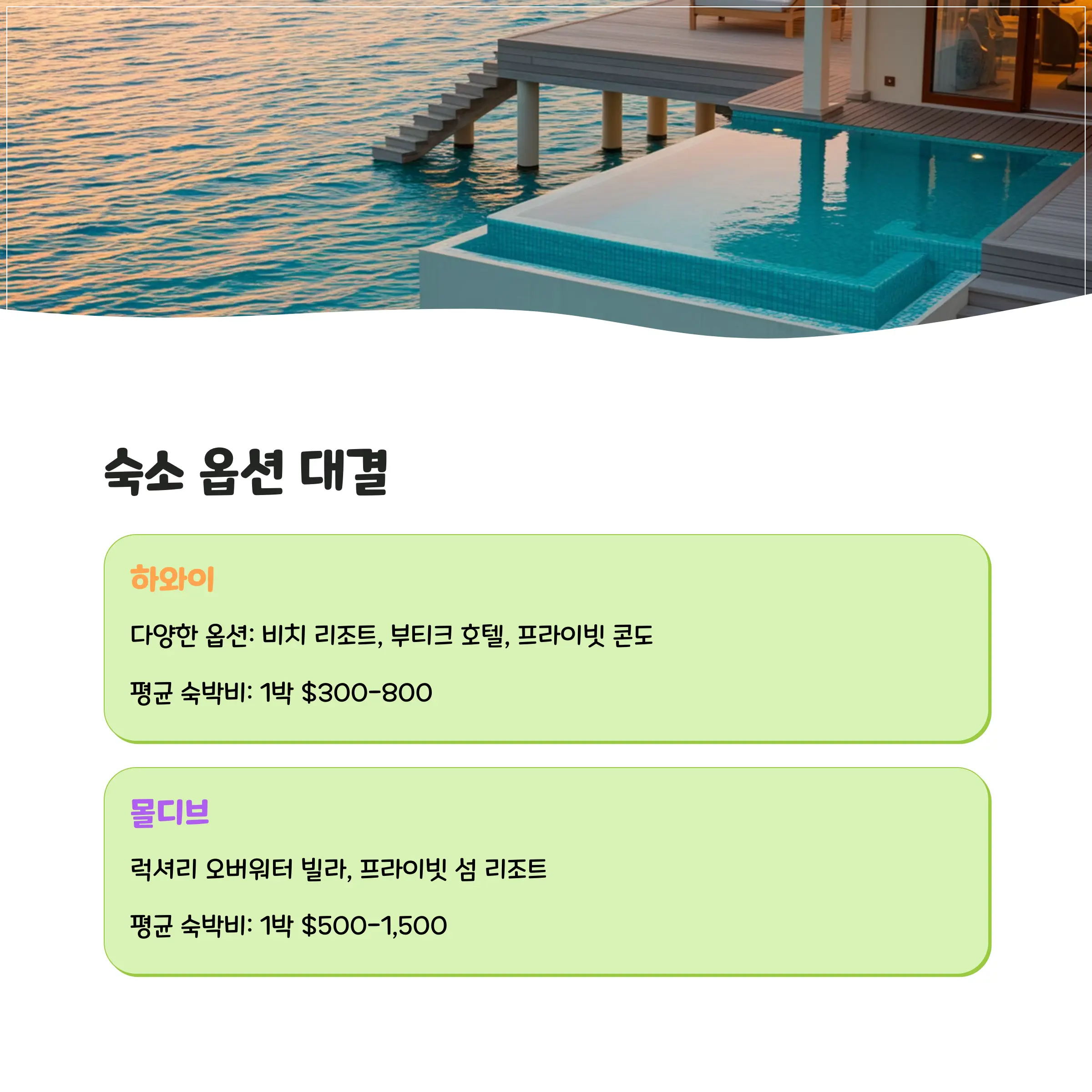 신혼여행에서 가장 중요한 포인트 중 하나가 바로 ‘숙소’ 예요. 하와이와 몰디브는 숙소의 종류, 구조, 콘셉트가 전혀 달라요. 또 식사 스타일도 차이가 커서, 만족도에 큰 영향을 줘요.