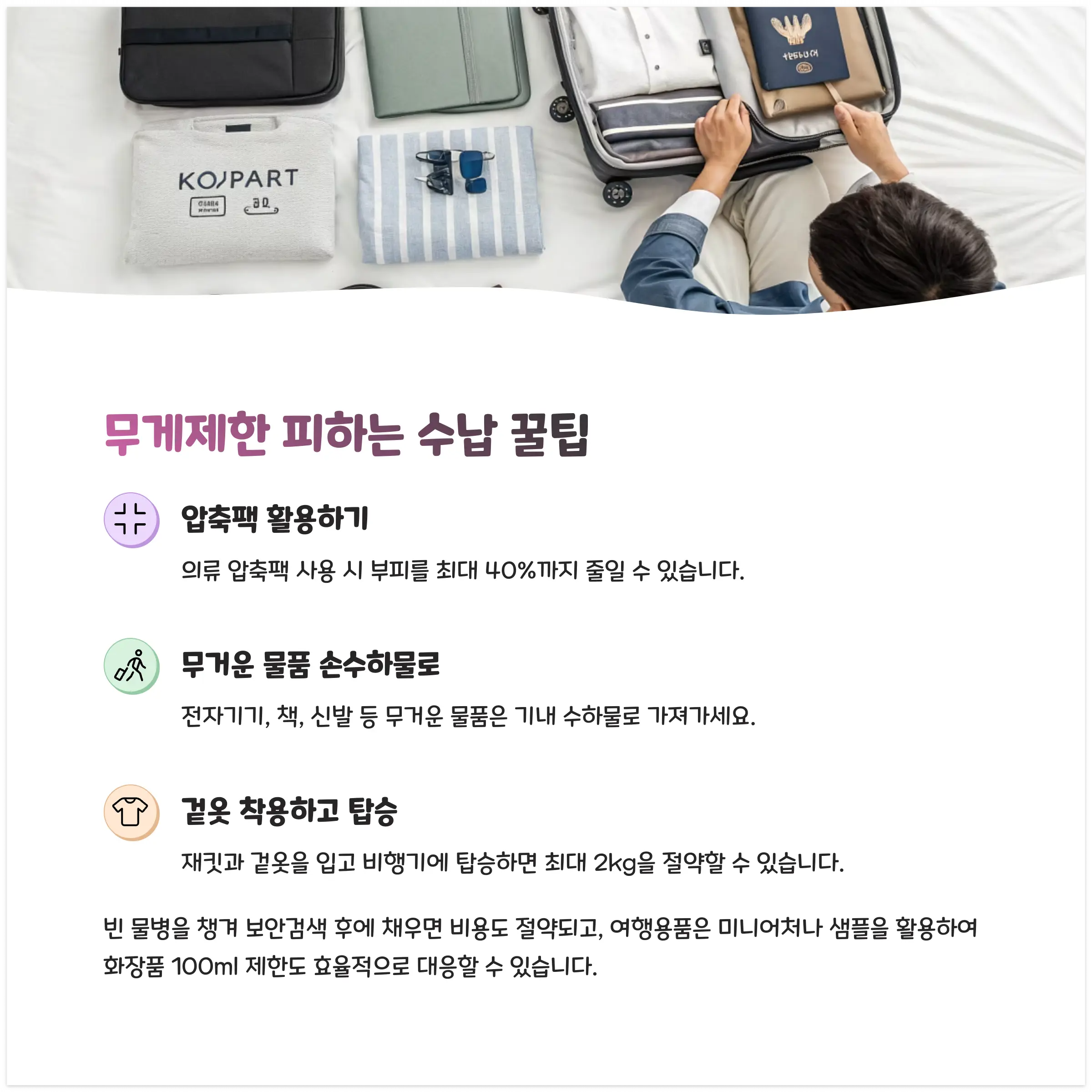• 🎒 의류는 반드시 '압축팩' 사용 (공간 절감 효과 최대 50%)
