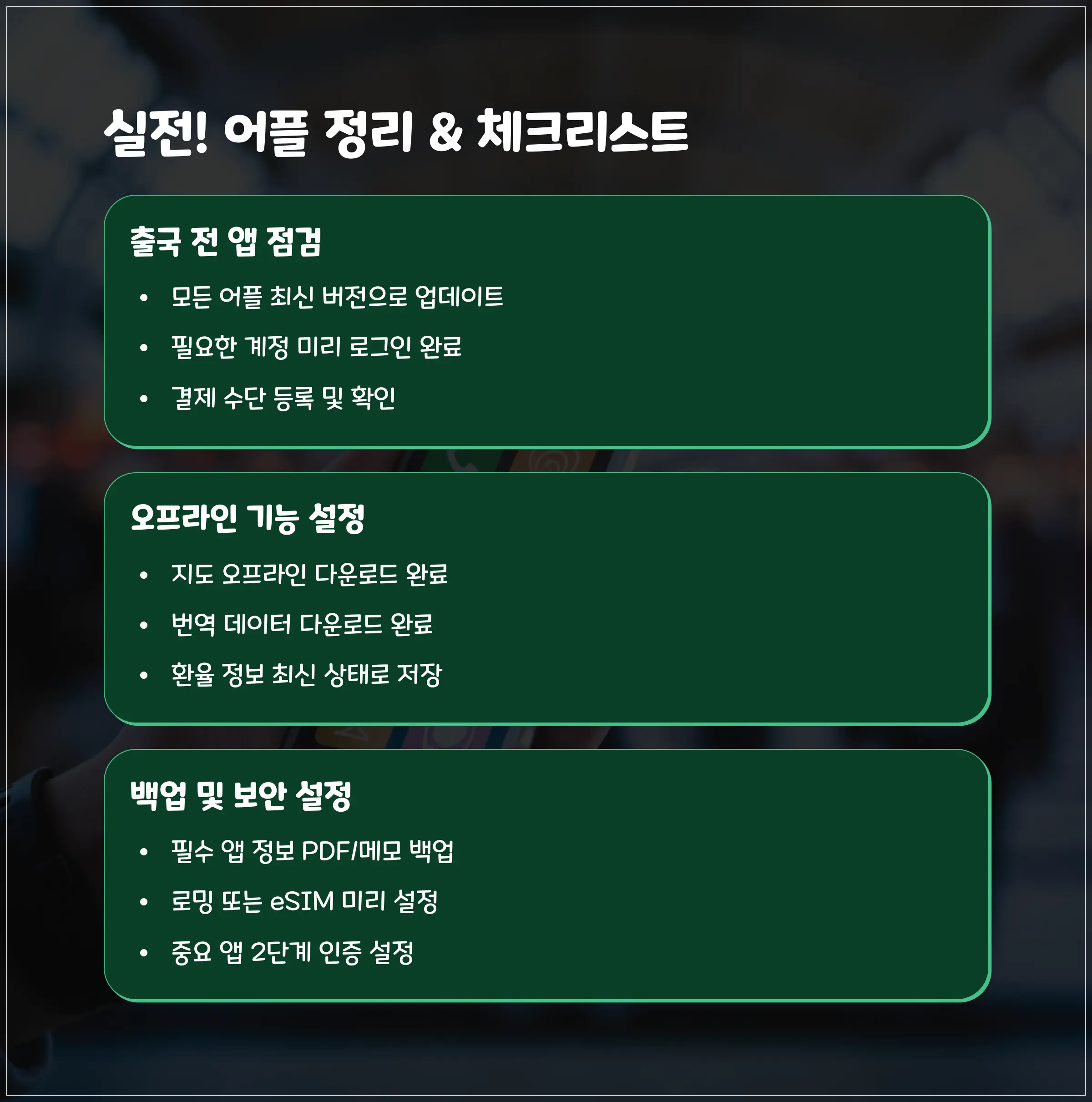 여행 출발 직전에 다시 한번! 필요한 어플 모두 설치했는지, 로그인까지 완료했는지 체크하는 게 정말 중요해요. 📋