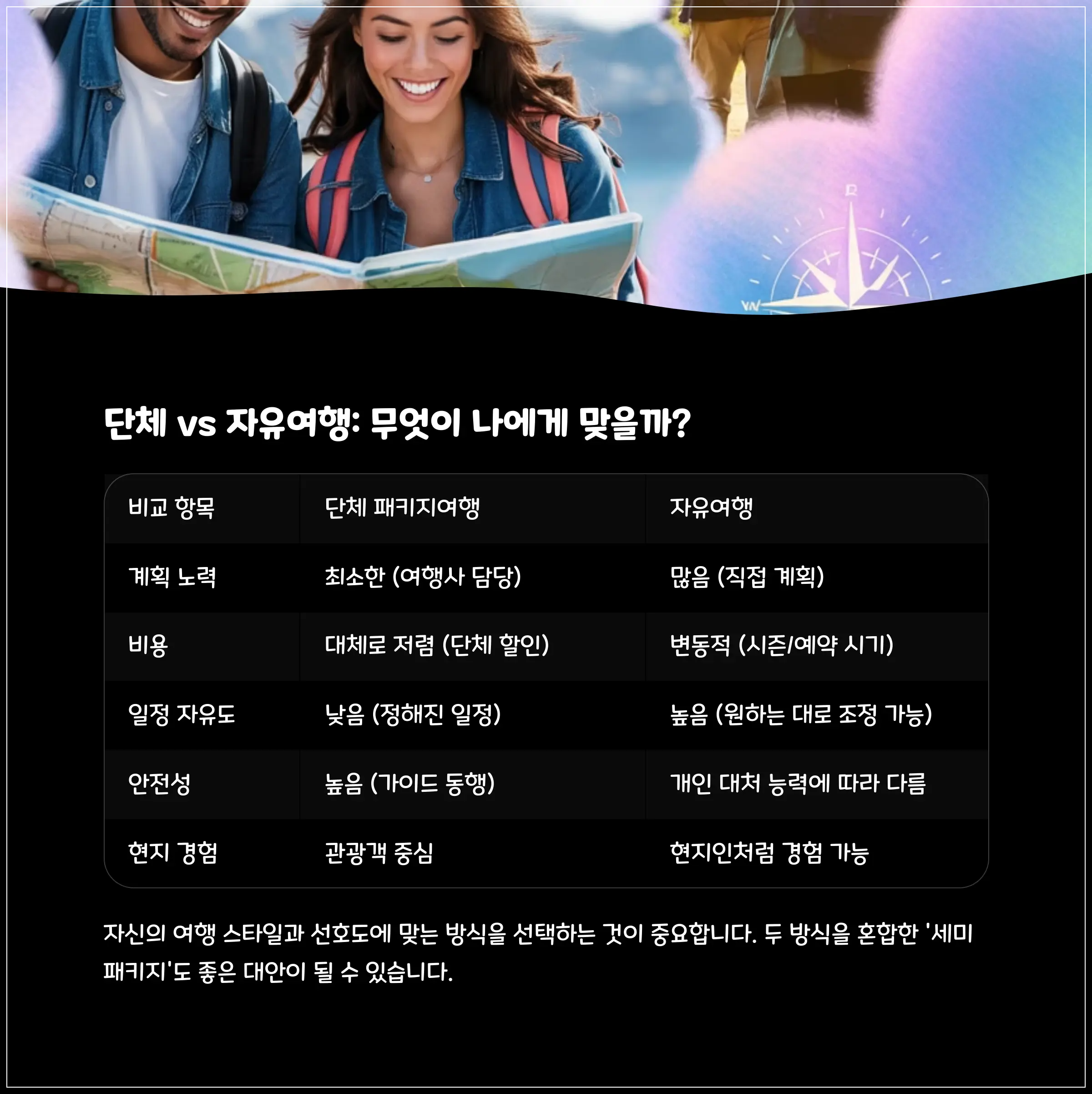 결론적으로, "편하고 빠른 여행"을 원하면 단체 패키지, "나만의 일정과 자유"를 원하면 자유여행이 맞아요. 본인의 스타일에 따라 선택하는 게 가장 중요해요! 🌏