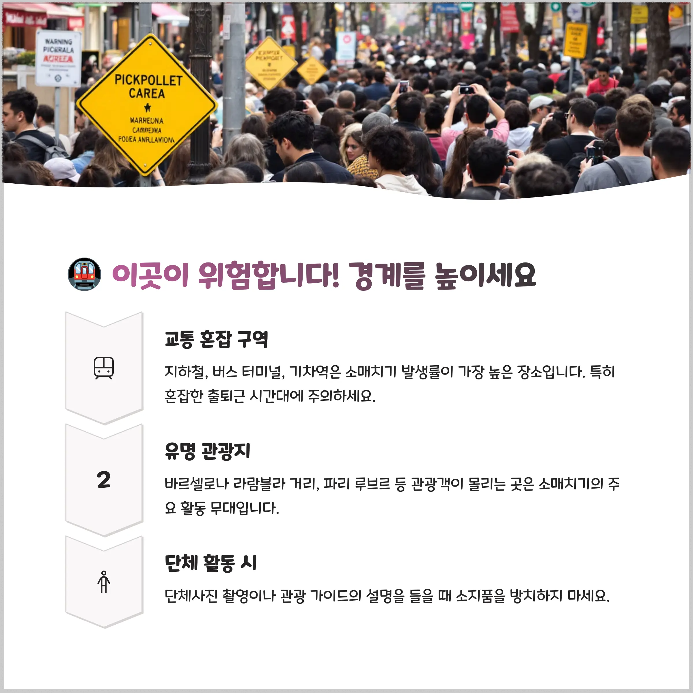 이제부터는 실제 여행자들이 가장 많이 소매치기를 당하는 장소와 순간들을 알려드릴게요. 어떤 장소에서 어떤 행동이 위험한지, 그에 대한 구체적인 대처법도 함께 설명할게요. 🚨