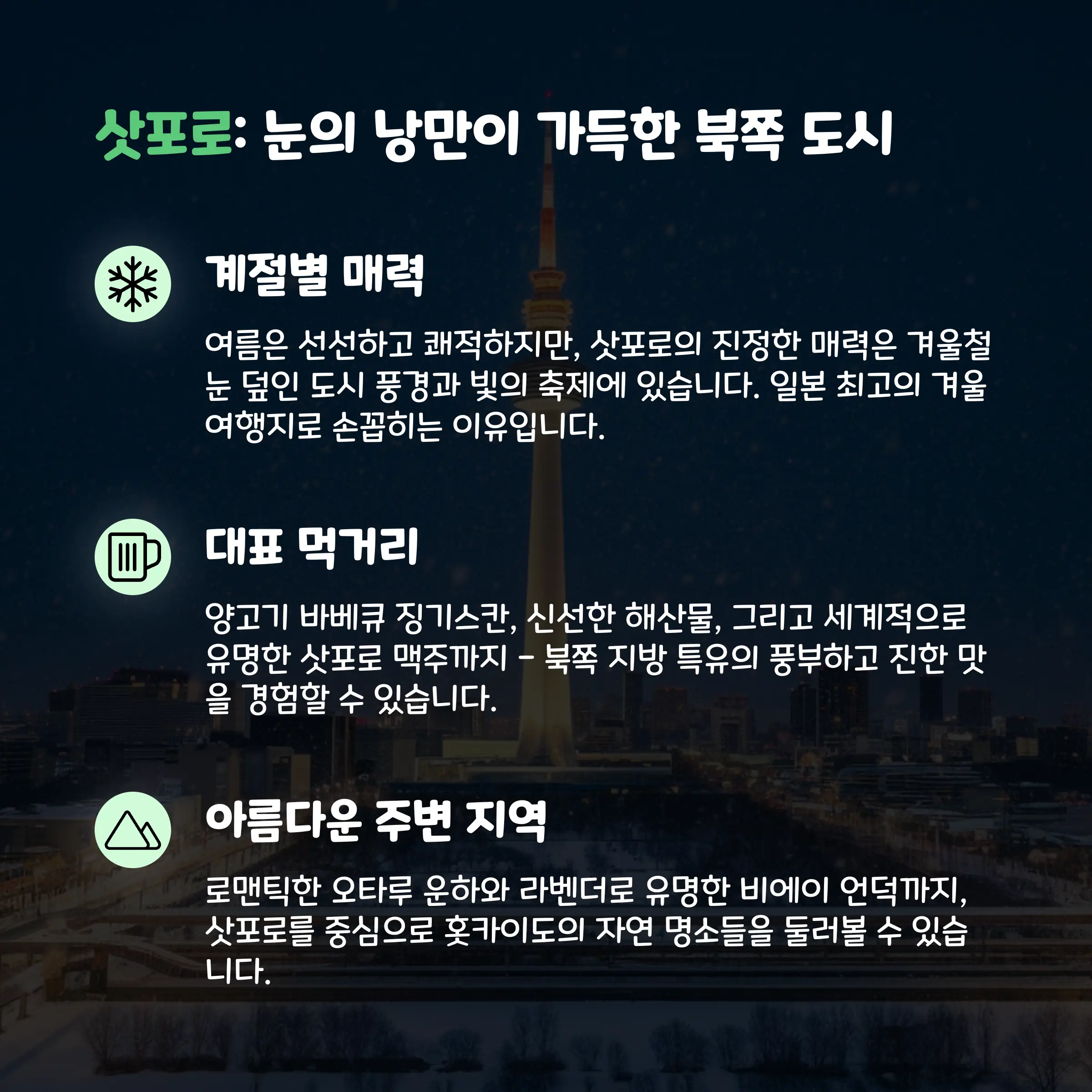 그리고 삿포로는 일본에서도 맥주 애호가, 온천 마니아, 야경 덕후들이 좋아하는 곳이에요. 도시 자체가 조용하면서도 근대적인 느낌이 강해서 혼자 여행하거나 커플끼리 힐링하기에 딱이죠.