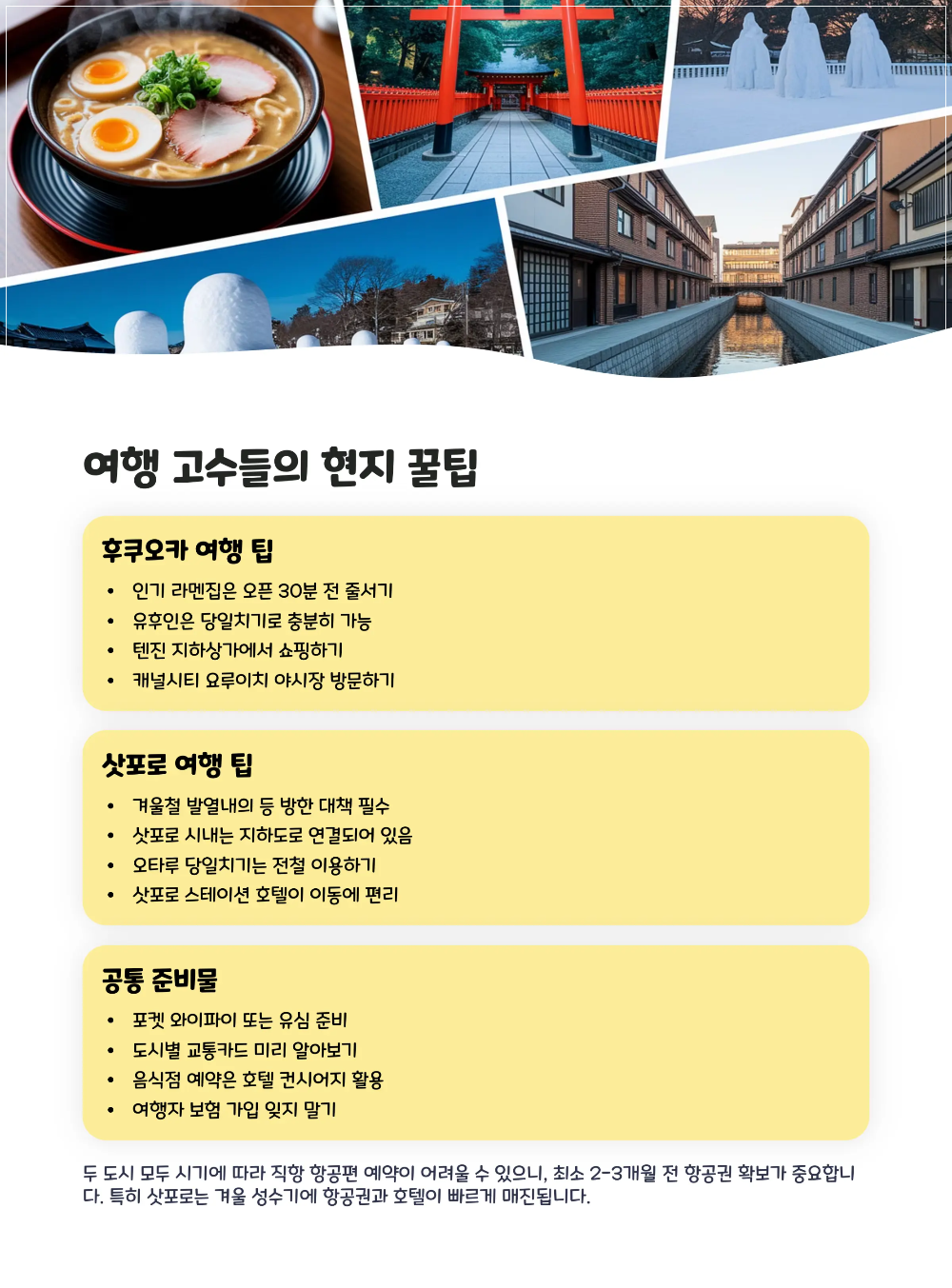 이제 여러분의 여행 스타일이 후쿠오카인지, 삿포로인지 좀 더 확실하게 그려지셨을 거예요. ✈️ 저는 개인적으로 혼자 걷고 사진 찍는 걸 좋아해서, 삿포로의 한적하고 눈 내리는 거리에서 정말 깊은 인상을 받았답니다.