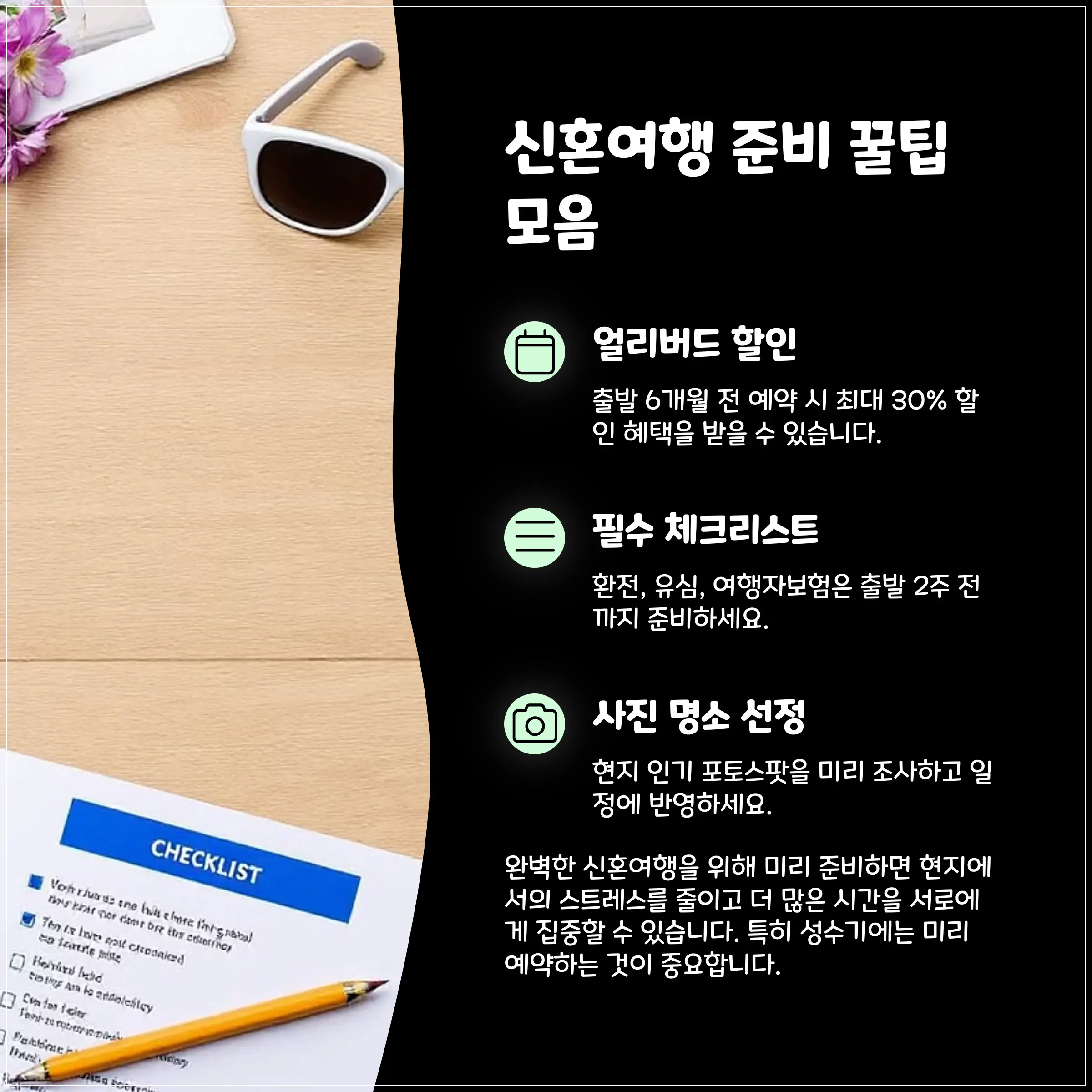 신혼여행은 인생 단 한 번뿐이에요. 그래서 꼼꼼하게, 사소한 것까지 체크해야 진짜 만족할 수 있어요. 두 사람만의 스타일에 맞춘 완벽한 여정으로 추억 가득한 신혼여행 되시길 바랄게요! 💑🌺